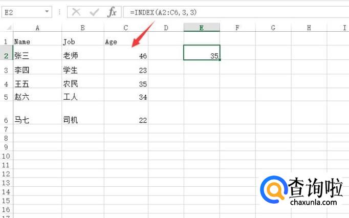 然后我们在一个空白单元格里输入index函数,注意它的参数,第一个参数是数据区域,第二个和第三个参数是要定位的数据单元格,如下图所示