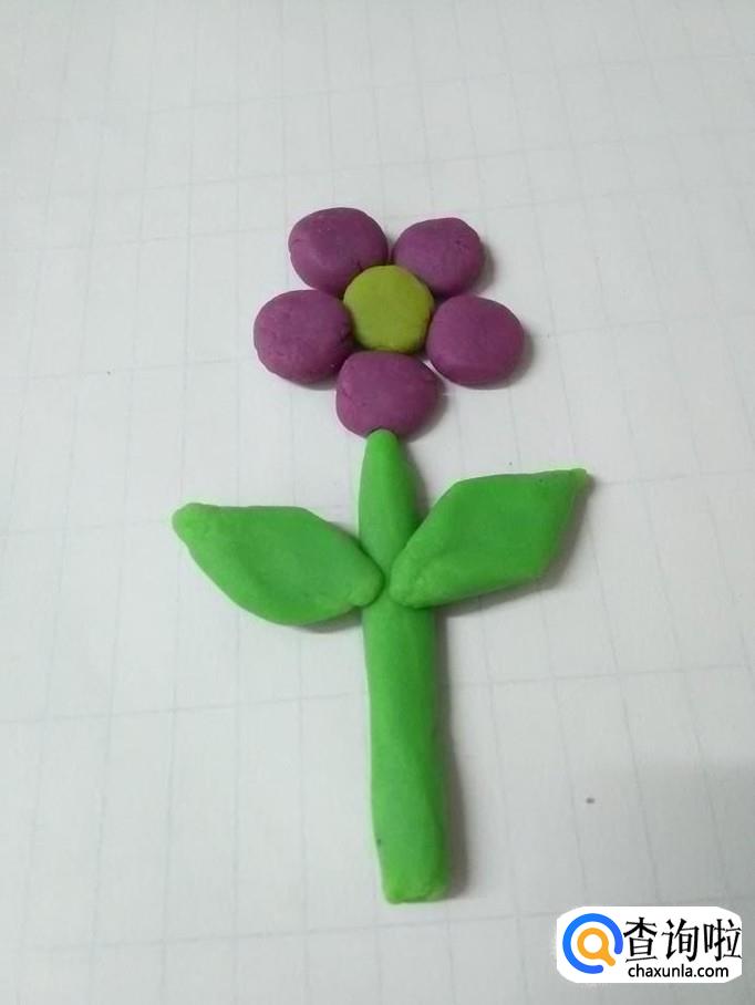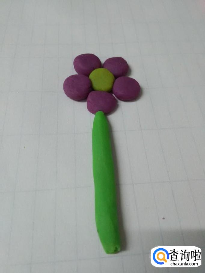 用绿色橡皮泥搓一个粗粗的长条,粘在花朵的下面,当作小花的花茎。
