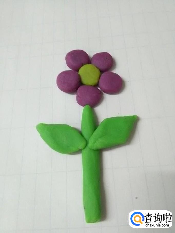 再用绿色捏两个枣核的形状,粘在花茎两侧,当作两片叶子,小花就做完了。