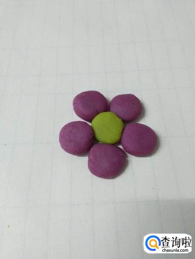 再将紫色橡皮泥团成五个小圆球,粘在黄色花芯的周围,当作五片花瓣。