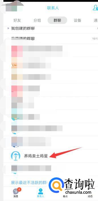打开手机QQ,点击界面下方的联系人,并选择一个自己加入的群。