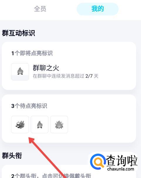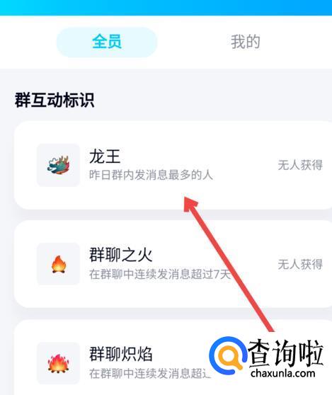 点击上方“我的”页面,在群互动标识下,可以看到待点亮的标识中,是否有龙王”标识。