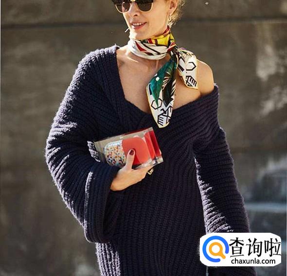 当身上的衣服是深色,容易显得人暗沉,那么就需要亮色的丝巾来搭配。下图中,针织裙是藏蓝色,这时可以选择色彩艳丽的丝巾来提亮造型。
