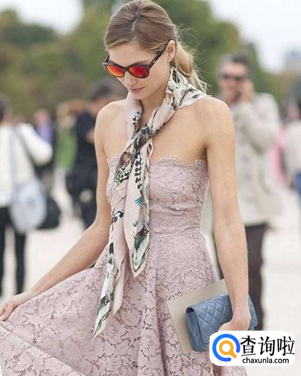 丝巾和衣服可以按照"相近色搭配"原则,比如裸色蕾丝裙搭配裸色底印花丝巾,这样搭配十分和谐,丝巾上的印花还起到锦上添花的作用。