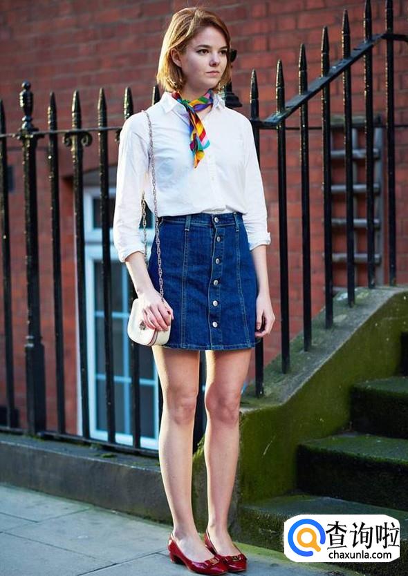 丝巾和衣服也可以依照"互补色搭配"原则,例如图片中橙色印花丝巾与蓝色牛仔裙,橙色和蓝色是互补色,这样形成小面积的撞色搭配,非常时髦。