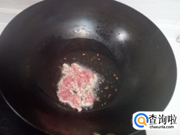 锅内放入油加热,油热后放入花椒爆锅,放入肉丝翻炒。