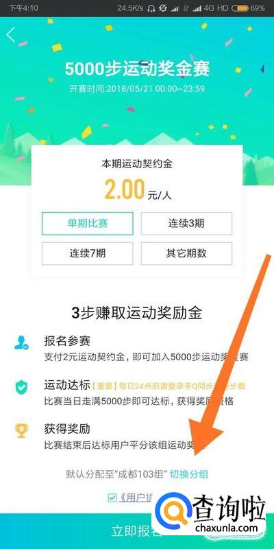 进入“运动奖金赛”页面后,可以直接点击“立即报名”,也可以切换比赛分组。