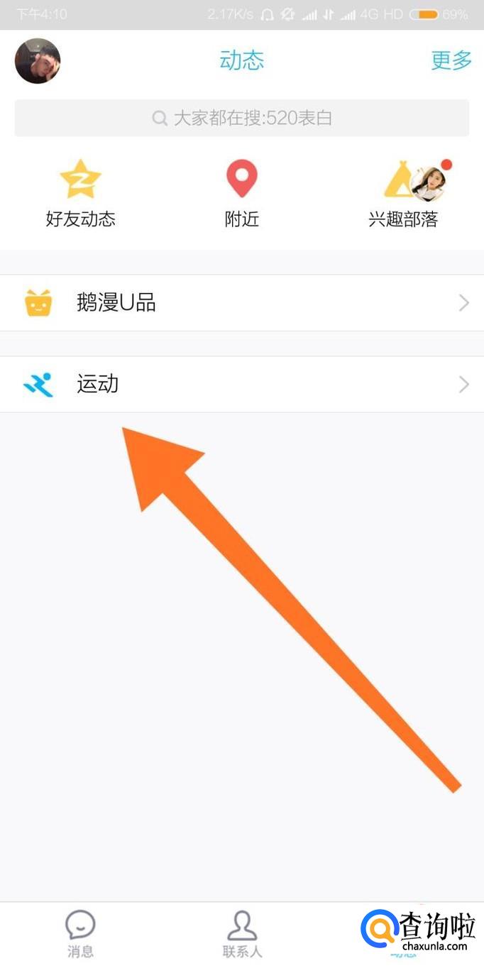 首先进入手机QQ“动态”页面,点击进入“运动”。