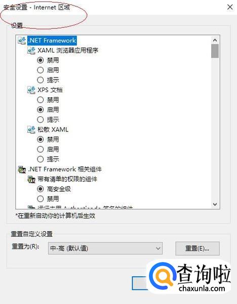 唤出"安全设置-Internet区域"选项,如图所示。选择"设置"选项区域,拖动右侧垂直滚动条。