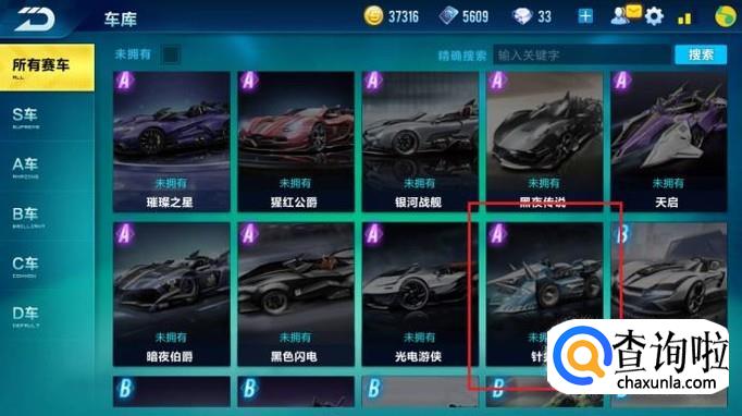 在车库的A级车中,找到并点击赛车“针尖”。