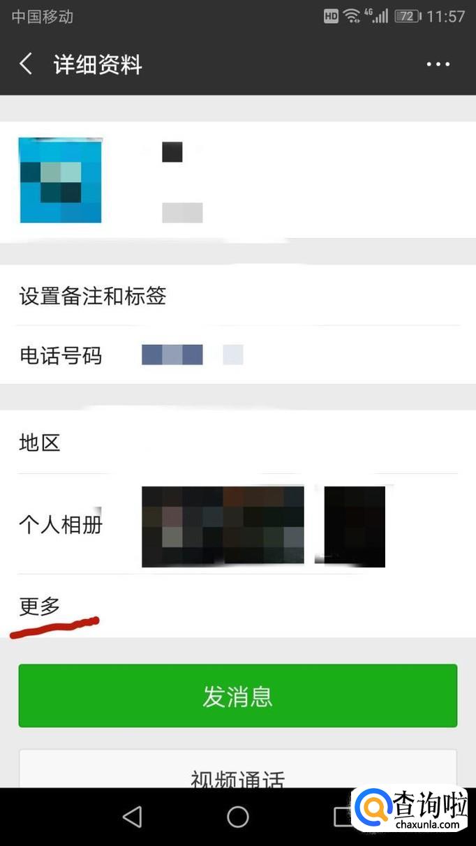 进入聊天信息后,点击好友头像进入详细资料,点击下方的“更多”进入。