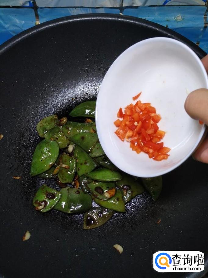 准备适量红椒,洗净后切碎,倒入锅中,和扁豆一起翻炒一下,这样可以让扁豆的色泽更加好看。