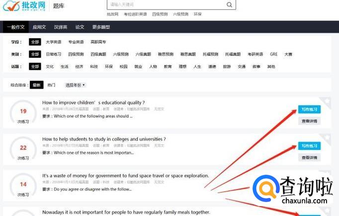 打开题库后页面如下,可以看到有很多题材可以写,挑好了想要写的点击题目后面写作练习即可。
