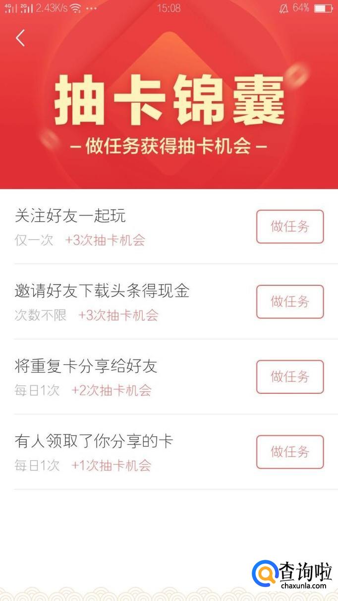 其实还有一个帮助集卡的方式,在今日头条首页面的搜索框中输入“发财中国年”点击搜索,搜索到之后点击第一个带专题图标的。