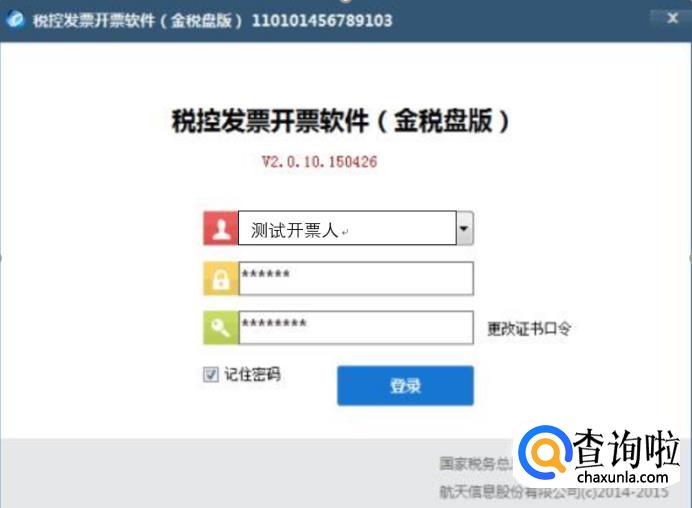 重新打开软件,这次输入“测试开票人”密码和口令,点击登录。