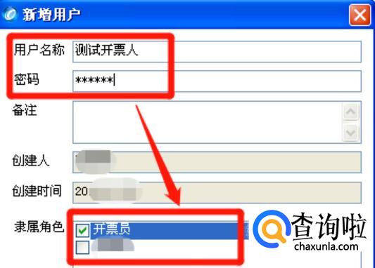 进入页面后,依次输入“用户名称”,“密码”,输入完毕后,在隶属角色一栏勾选“开票员”,确认无误后,点击确定。