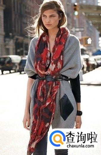 将围巾披在肩上,然后找一根腰带,将前端垂下来的围巾系在腰上,这样就不怕找不到外套搭配围巾了,而且还为自己增加了一件小外套。