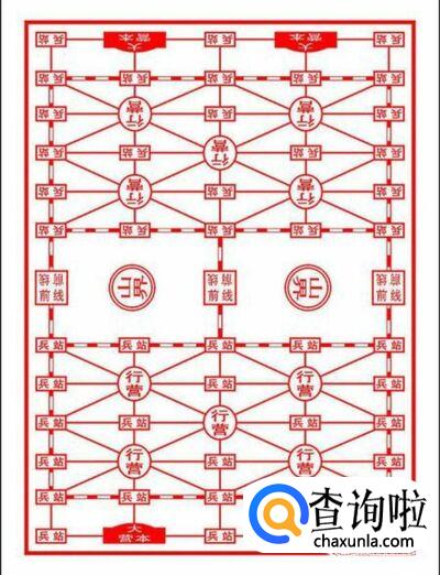 首先我们应该对军棋棋盘有一个大致的了解。双方个有两个大本营、四个行营、23或25个兵站。大本营是军旗的位置,一旦军旗被敌人偷走你就输了;行营是保护棋子的区域,行营中的棋子不能被其他棋子吃掉;兵站是摆放棋子的位置。行走的路线有两种,一种是铁路线,一种是公路线。铁路线是快行线,铁路线上的棋子依次可以走很多步;公路线是慢性线,公路线上的棋子每次只可以走一步。
