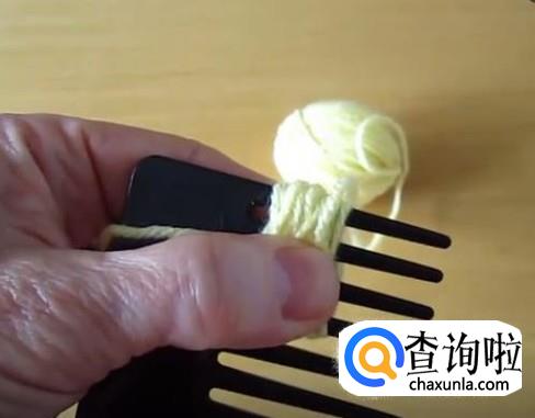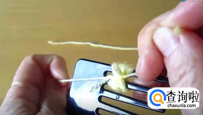 将毛线缠在两根梳齿之间,形成一个线圈,用一根单独的稍长的毛线从中间绑紧,取下来。