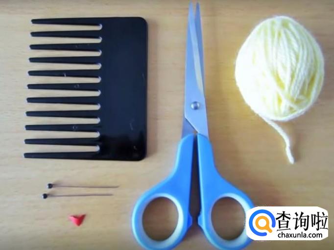 黄色毛线团,剪刀,梳子,带黑头的长钉,红色硬纸片