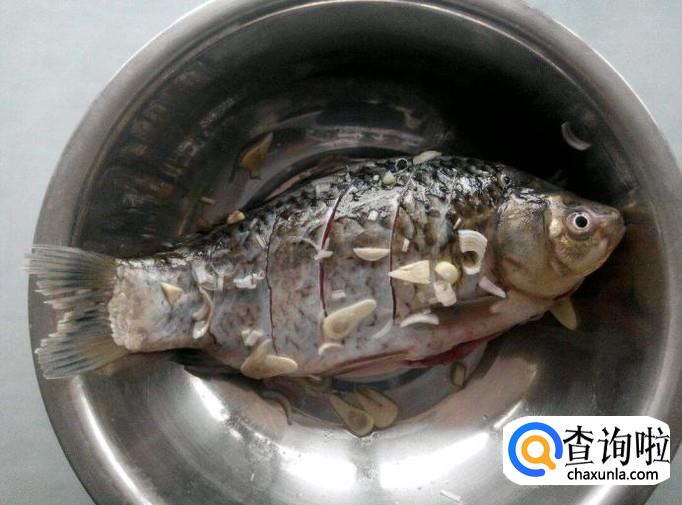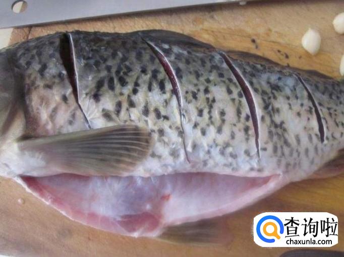 先将鱼处理一下,内脏鱼鳃取出,买鱼的时候一般老板就会帮你处理好的,然后鱼身上改刀,放入适量姜片和葱丝,倒入少量料酒腌制30分钟去腥味。