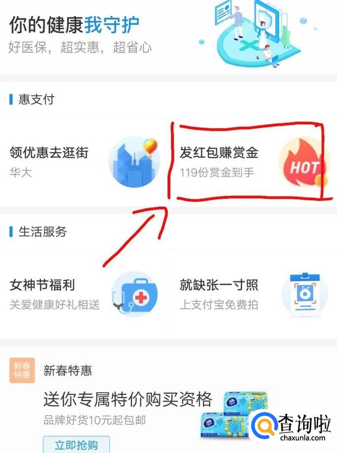 打开手机支付宝,在首页界面找到[发红包赢赏金]