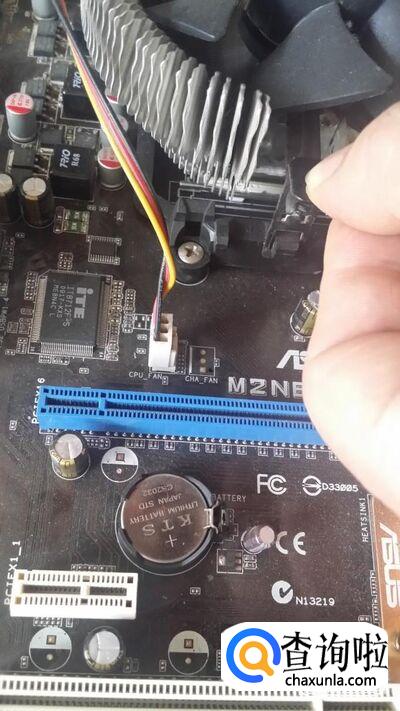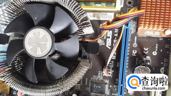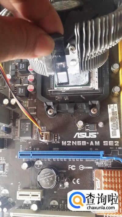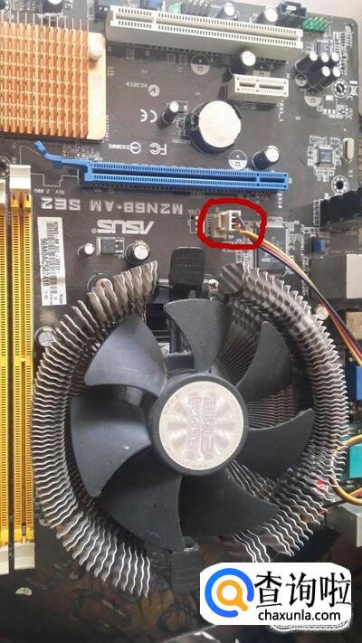 如图的风扇使用扣具扣在CPU底座的,它有一个插头插在主板上,把它拔下来。