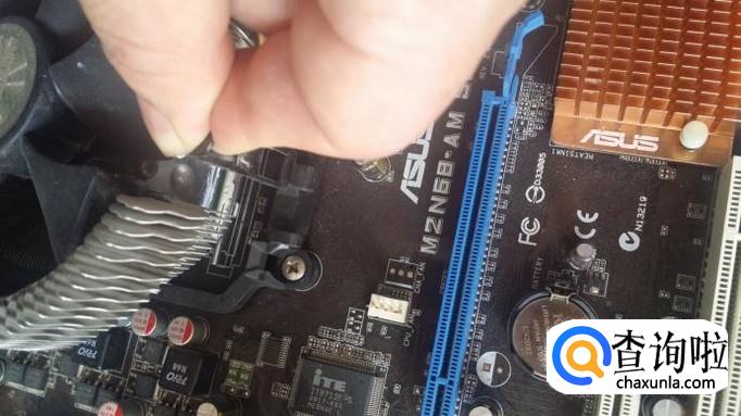 然后用手在一边的扣具上用力向下按再向外松开扣具,再把另一边的扣具退出,这样就把散热器取下来了