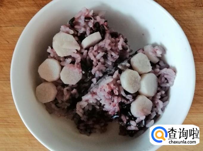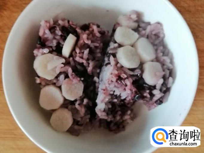 大约是五分钟后,指示灯调至保温状态,这时大米已蒸熟,一般不要急着打开锅盖,最好再闷5分钟左右,拔下电源打开锅盖,这样山药大米黑米饭就蒸好了。