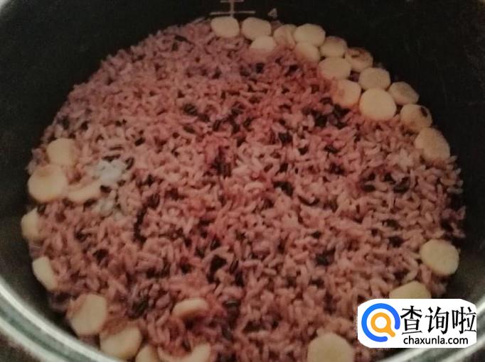 电饭锅放好米后,加入适量清水,一般水比米高处一个指节比较合适,这样蒸出来的米软硬适中,水加好后放入备好的山药片。