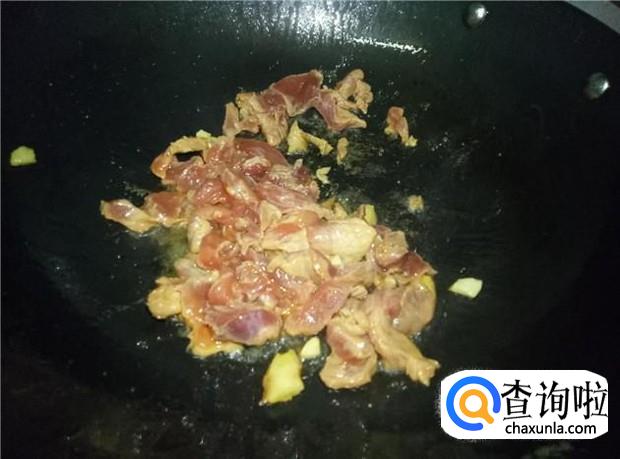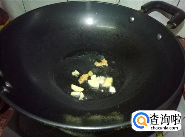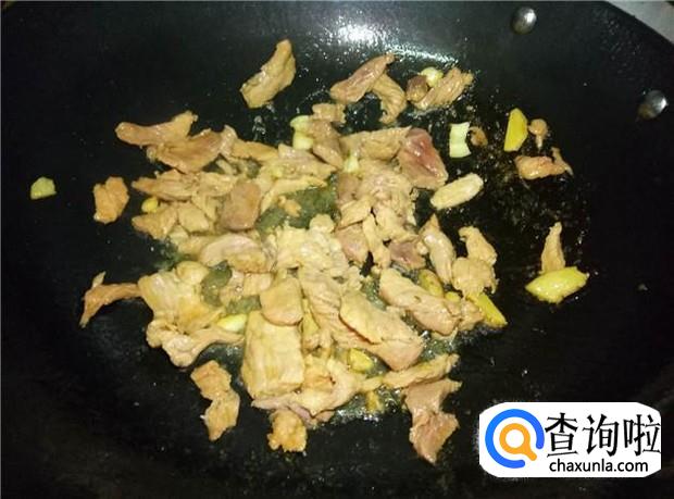 热锅下油,放入蒜头和姜片煸香,然后倒入瘦肉,快速翻炒均匀。