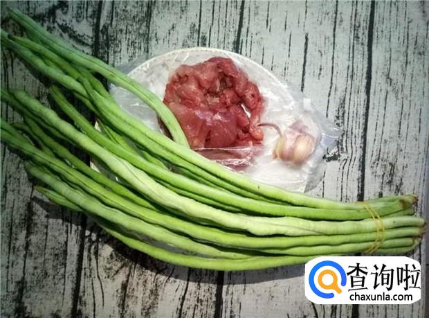 准备好所有原材料:长豆角一小把、瘦肉适量、蒜头两瓣、姜适量。