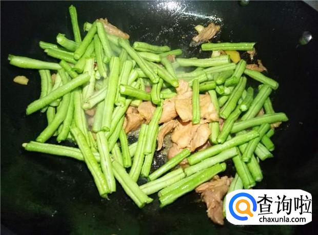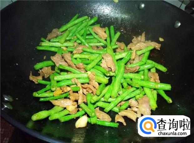 瘦肉翻炒变颜色后,倒入豆角翻炒,加入适量的盐,大火翻炒。