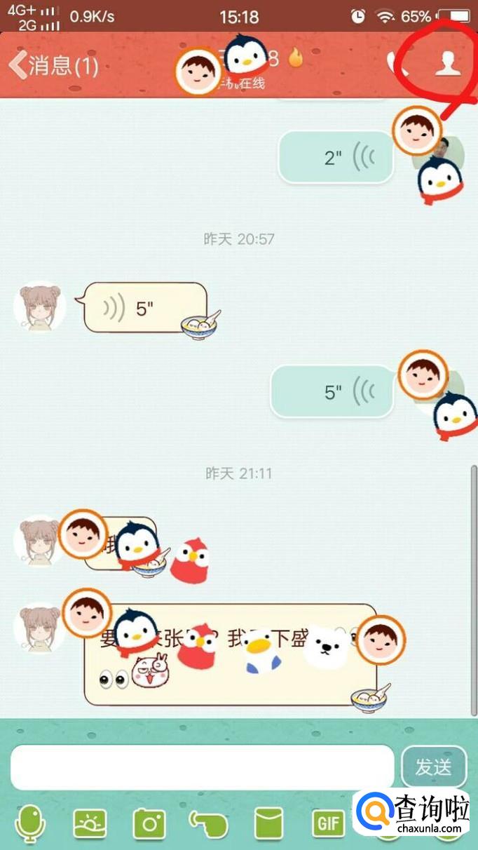 接着,点击进入到聊天状态,并且点击右上角的人的图案。