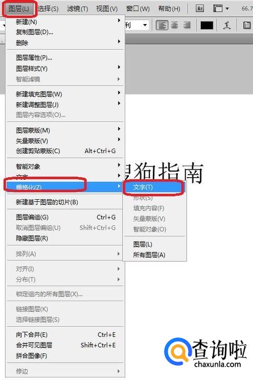 选中新建的文字图层,如图所示,依次点击“图层”,“栅格化”,“文字”。设置之后右下侧图层框中,文字图层就栅格化了。