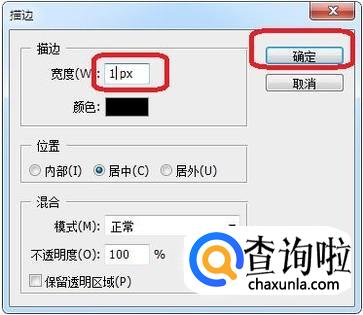 出现“描边”面板,如图所示,原文字宽度为1像素,我们设置成3试试,点击确定。