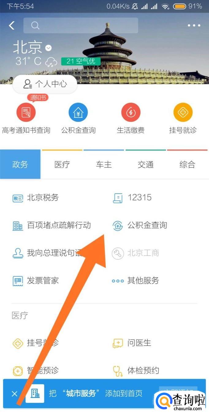 进入“城市服务”页面后,支付宝可以自动定位所在城市,也可以根据需要选择查询其他城市。接下来点击“政务”窗口下的“公积金查询”。