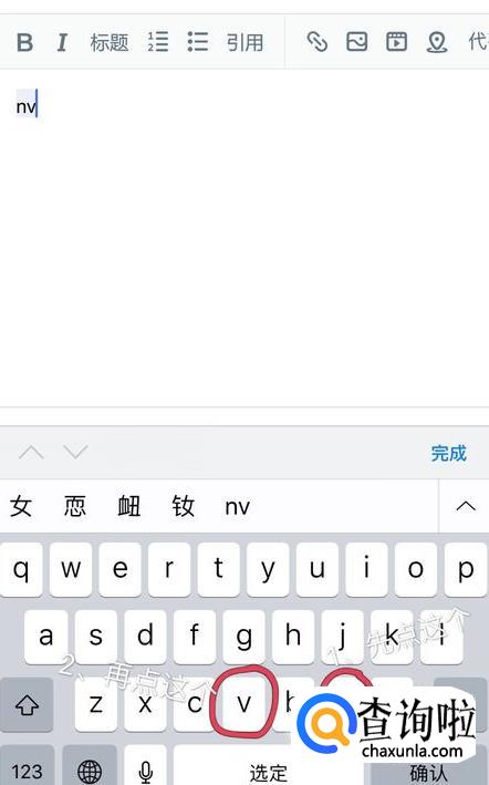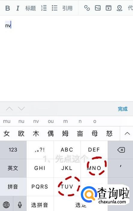 如果使用的是全键盘拼写的话就先点“n”,再点“v”,就可以打出“女”字。