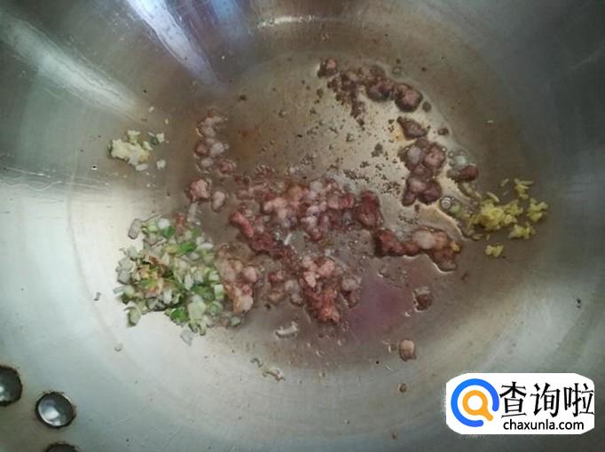炒锅放花生油,油五成熟时,放入肉粒炒至变色,再放入葱姜蒜煸炒出香味。