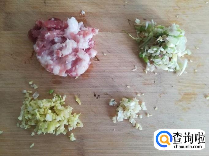 把猪五花肉切成碎粒,葱、姜、蒜切成末。
