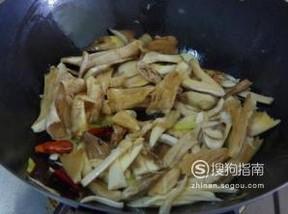 等配料炒香后倒入鸡枞,放入一些干小米辣,加一点香油大火爆炒,等鸡枞熟后撒上一点盐翻炒均匀就可以出锅啦!