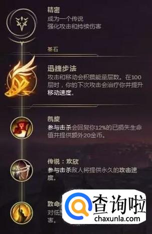 至于凯旋,女警只要参与了击杀,就能迅速地回复血量,再加上迅捷步法和一些吸血装备使自己能够迅速回复到安全血量,继续回到线上发育,同时只要参与击杀就能获得金币,这能使凯特琳完美扩大自己的雪球优势。因为女警的被动,所以攻速很重要,高攻速能让女警快速叠满被动,打出爆头,所以点出了欢欣。致命一击能提高对残血敌人的伤害,配上爆头,面对残血敌人时保证一枪带走.