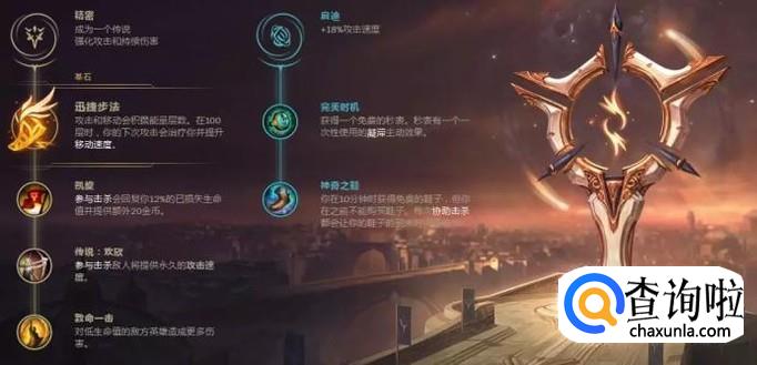 现在这个版本,对于女警这种非主流ADC来说,保证自己在线上能赖着不死是最重要的,所以没有选择攻击性的符文,因为像强攻这种并不能很好地在女警身上发挥出作用,反而迅捷步伐提供的血量回复才是女警所需要的。它可以大幅度提高女警的回复能力,同时将她的赖线能力和消耗能力提升一个层次,让她在线上从经济经验方面打出优势。