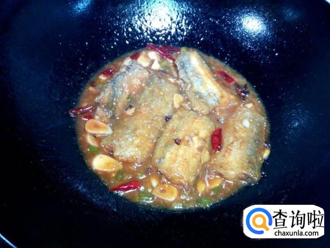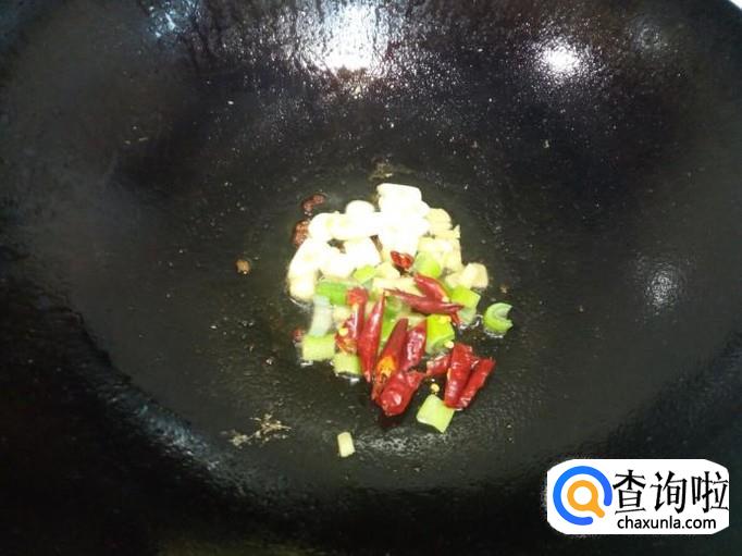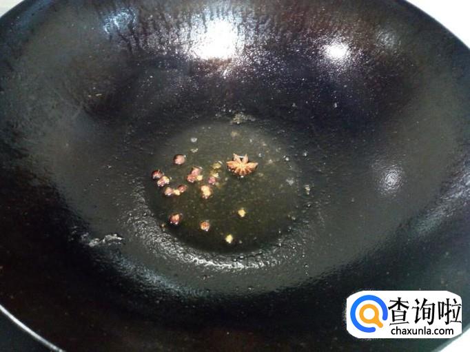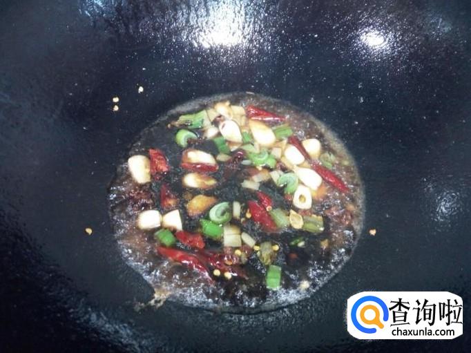 煎塌刀鱼剩下的底油(剩的油要是多,就盛出一些),放入花椒,八角,红干椒,葱,姜,蒜爆锅。