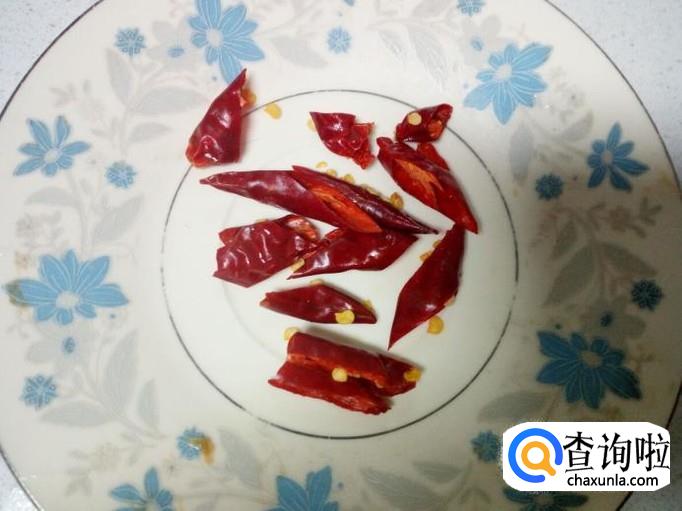 红干椒用水清洗干净,控干水分,斜刀切成段。切好葱,姜,蒜,备用。