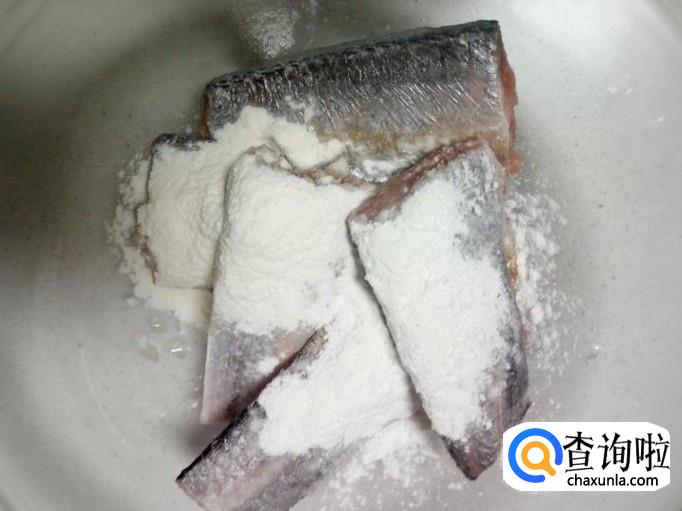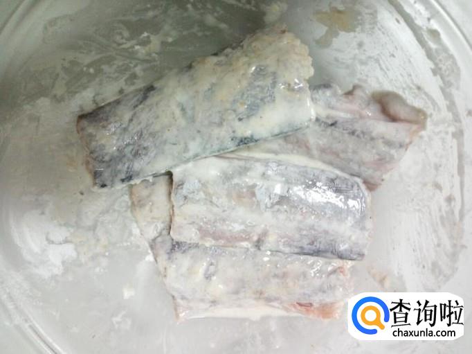 把腌制好的刀鱼,放入1:2的淀粉和面粉(淀粉1,面粉2),兑少许水,拌和均匀,使刀鱼挂糊。