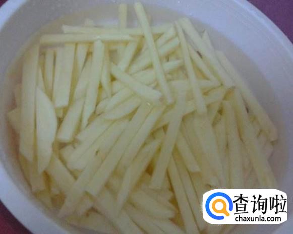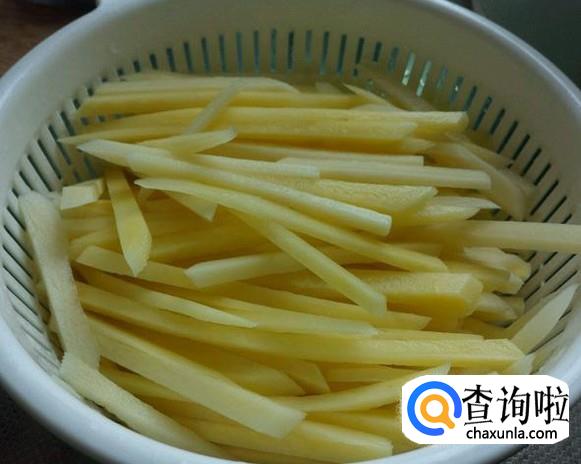 将切好的土豆条放入清水中浸泡一会后捞出沥干水分。