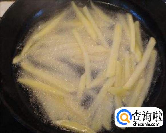 锅内倒入宽油,油温8成热(筷子放入冒泡)时放入土豆条炸制,炸至土豆条呈微焦色后捞出。