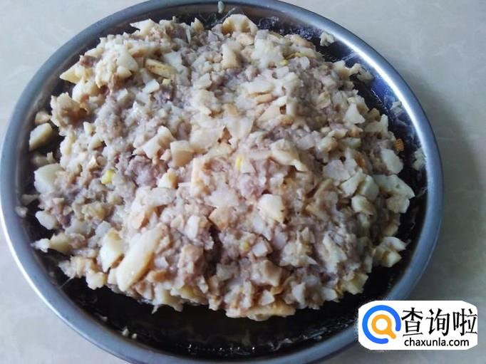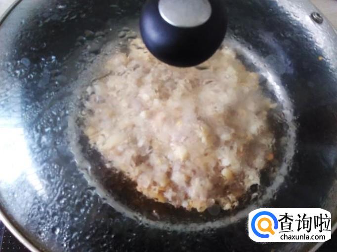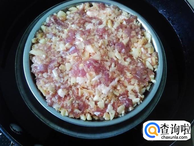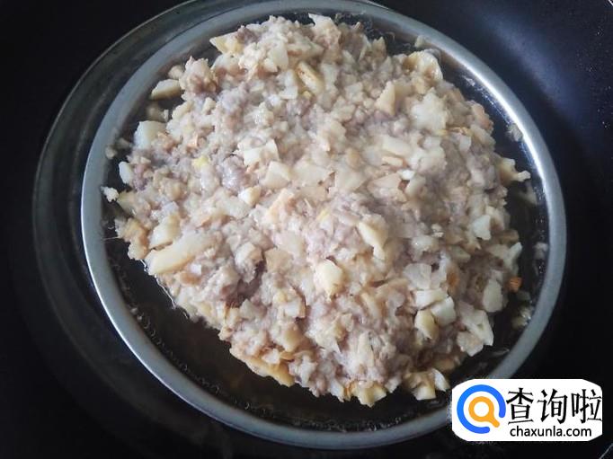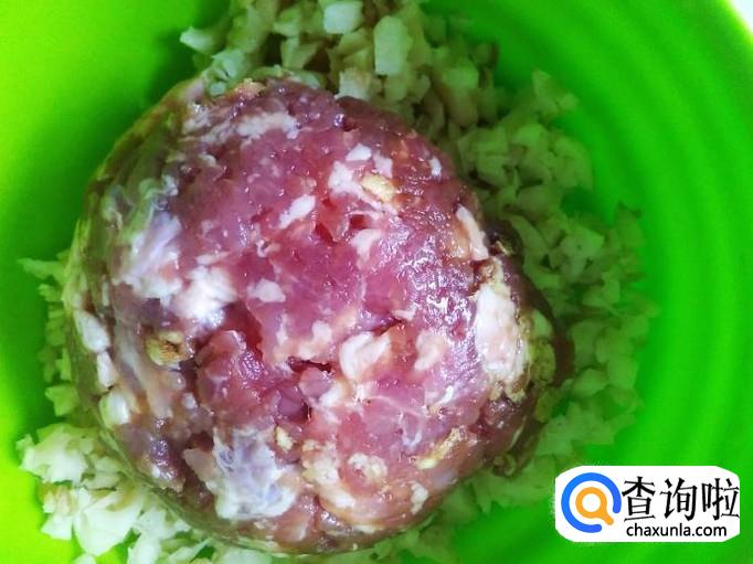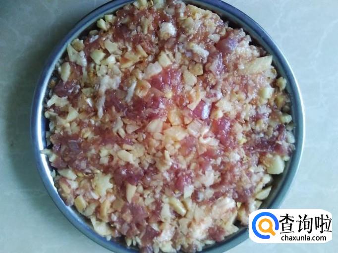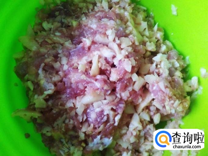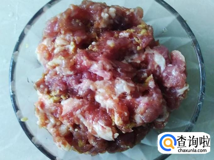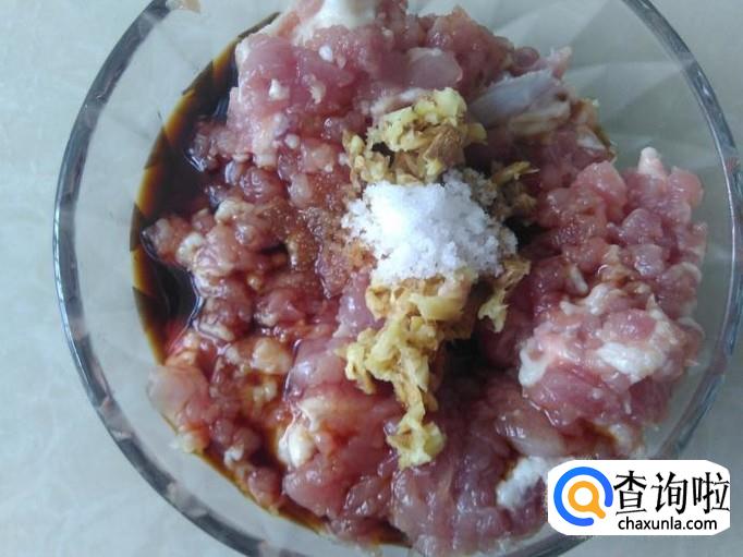 猪肉剁成肉饼,加适量的盐、姜蓉、1勺生抽、1勺料酒腌制几分钟。