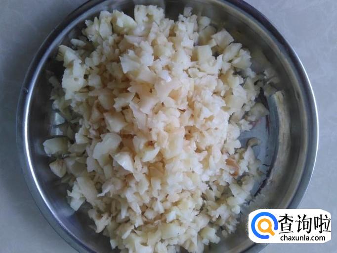 莲藕去皮,然后切成碎丁。